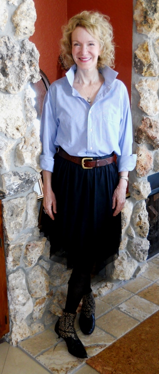 Hello again, and thanks again, dear Patti! I'm really pleased you chose today to show this particular outfit (which looks especially cool on you … very pretty and feminine … suits your style!) I 'm waiting on my just-purchased tulle skirt and pondering what to wear it with. I will immediately try the masculine/feminine approach! Thanks so much for being psychic!