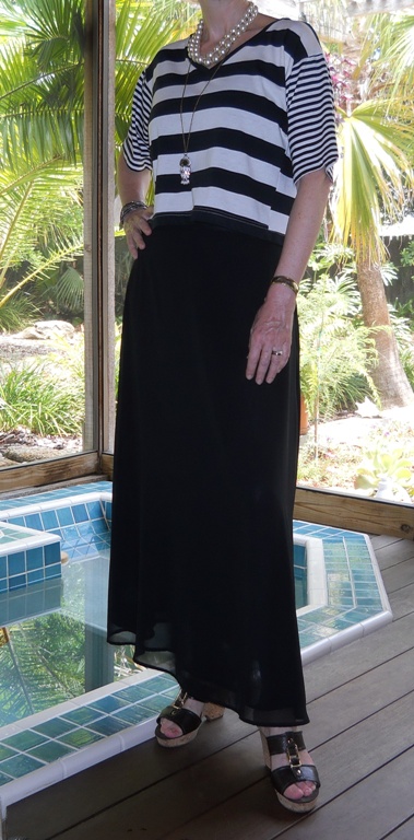 I love stripes, just love ’em. I added my chunky faux pearls today, in honor of VM. Mr. Owl is a regular feature who always makes me smile. My high wedges make me walk with with a little more attitude. And now I see my skirt is a bit sheer, oops. More meaning to Visible Monday than I had planned.