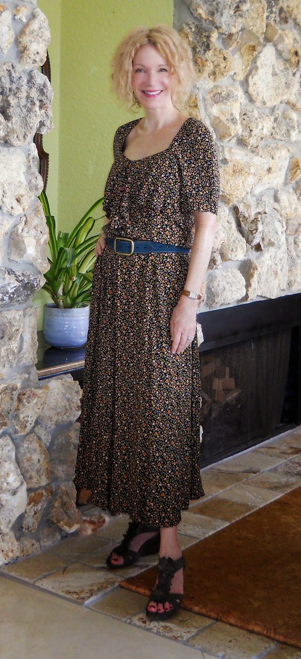 You look wonderful in your long dresses, Patti, and this one is no exception! The blue belt adds a cool vibe too. Come to the PNW for some boots weather. π