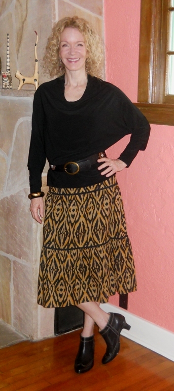 Top: Norma Kamali for Wal-Mart; Skirt: Jones New York, thrifted; Boots: Soft; Belt: Guess |