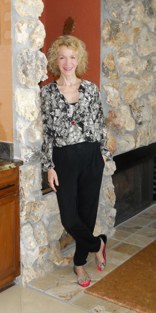 Today I wore these ASOS trousers with an old Anne Klein print blouse. I think the look is good, but not the very best for my long torso. It’s a l-o-n-g walk from my waist down to my lower hip.