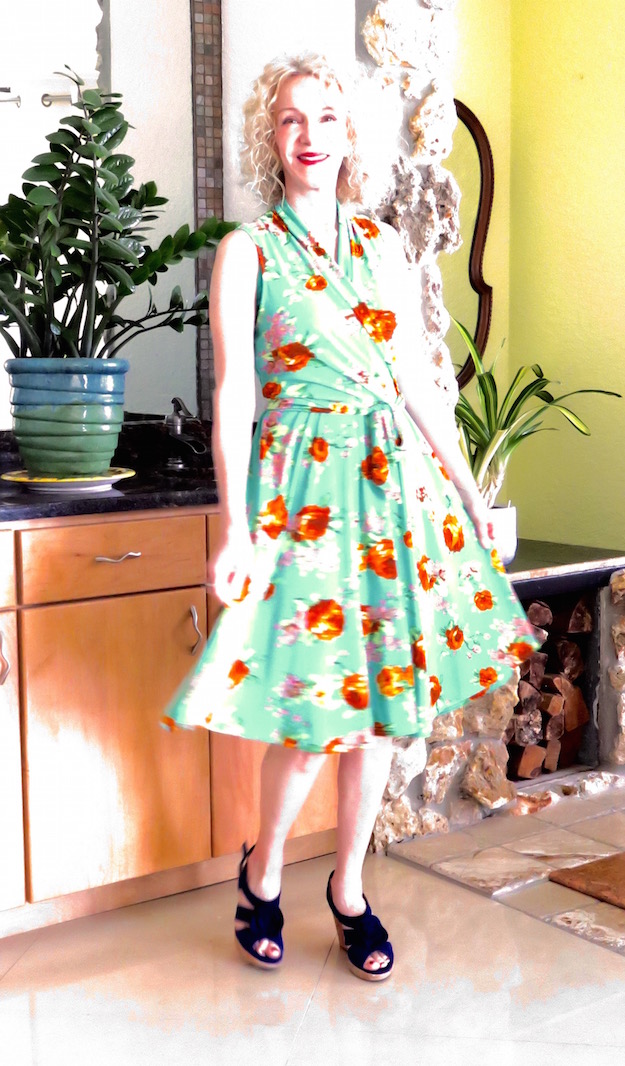 This Ruby dress (similar) is splendid for any body shape: it’s a faux-wrap with a modest vee-neck and full skirt. I added only my favorite blue suede wedges (similar) and Wendy B ring.