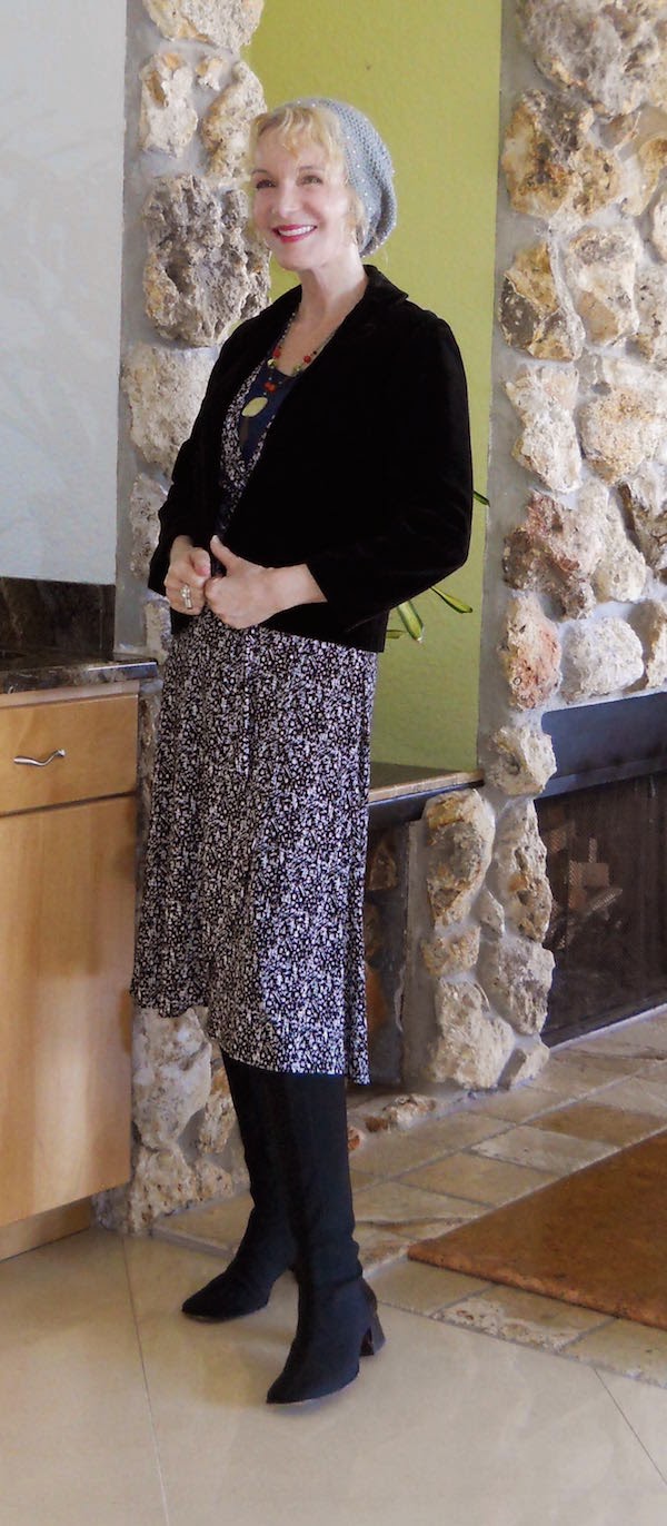 Today, for example, was a frosty 65-degree Florida winter day. Perfect for a favorite wrap dress by Karina Dresses, tights and tall boots (similar). The boots were a super-steal from one of my NYC thrifts: they’re by Donald J. Pliner, made of leather and fabric inserts.