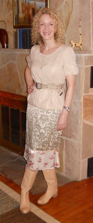 I added an Ann Taylor Loft blouse, thrifted a while ago, and Gianni Bini caramel boots. A woman stopped me in the grocery store tonight just to say “I love your outfit!” Aww, thanks Sheila.