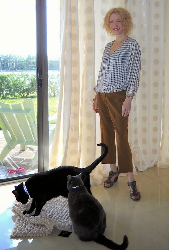 On top is the Cynthia Rowley blouse (similar) I found in St. Petersburg, at Revolve Clothing Exchange. I wear it a lot because it meets all my criteria: flattering, versatile, and easy to wash and dry. Lazy, that is me. Hope you enjoy a peek at our view – the ocean is just over those bushes, and please pay no attention to the parking meters.