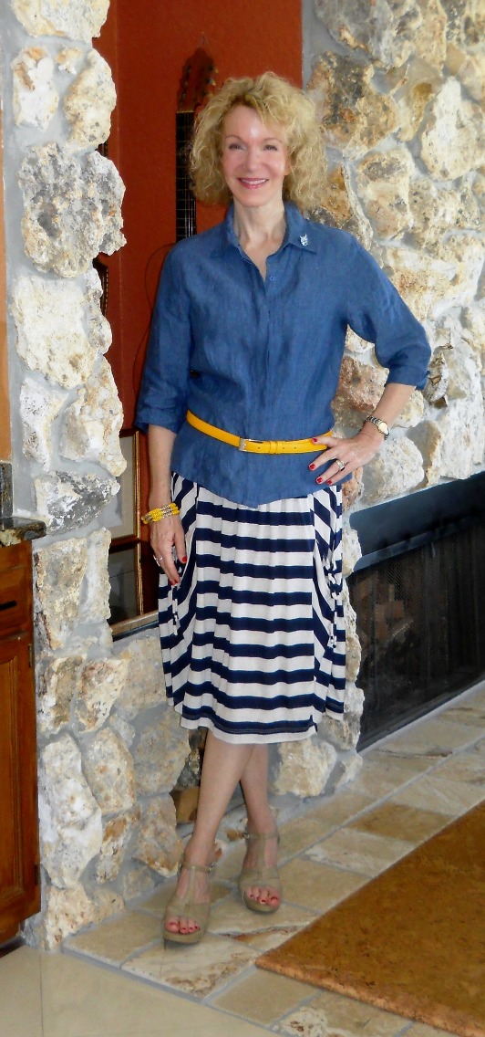 This is a great look on you, Pattti – very much your style and fit, but I like the stripes and blue linen with the bright yellow as a change from your usual lovely florals. Perfect for an easy Friday! xxxx