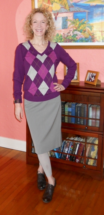 The sweater is by Izod, all cotton, and was thrifted for about $3 at the Daily Bread Thrift Shop. I support all their activities, and I’m happy to contribute whenever I can. The skirt is an old standby, by To The Max.