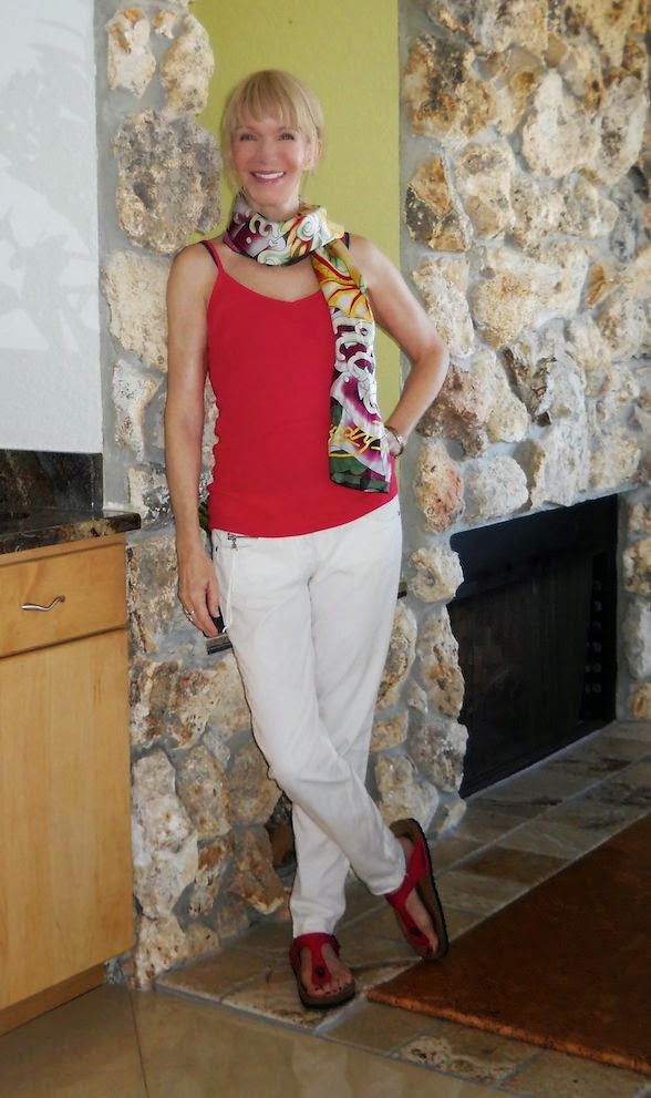 I added a silky scarf by Christian Audigier for Ed Hardy. I love the fabric and the colors, and the price: I bought it at a local consignment store for $15. Birkenstock Gizehs for my feet. Must keep up the pedicures through at least October, in the sub-tropics.