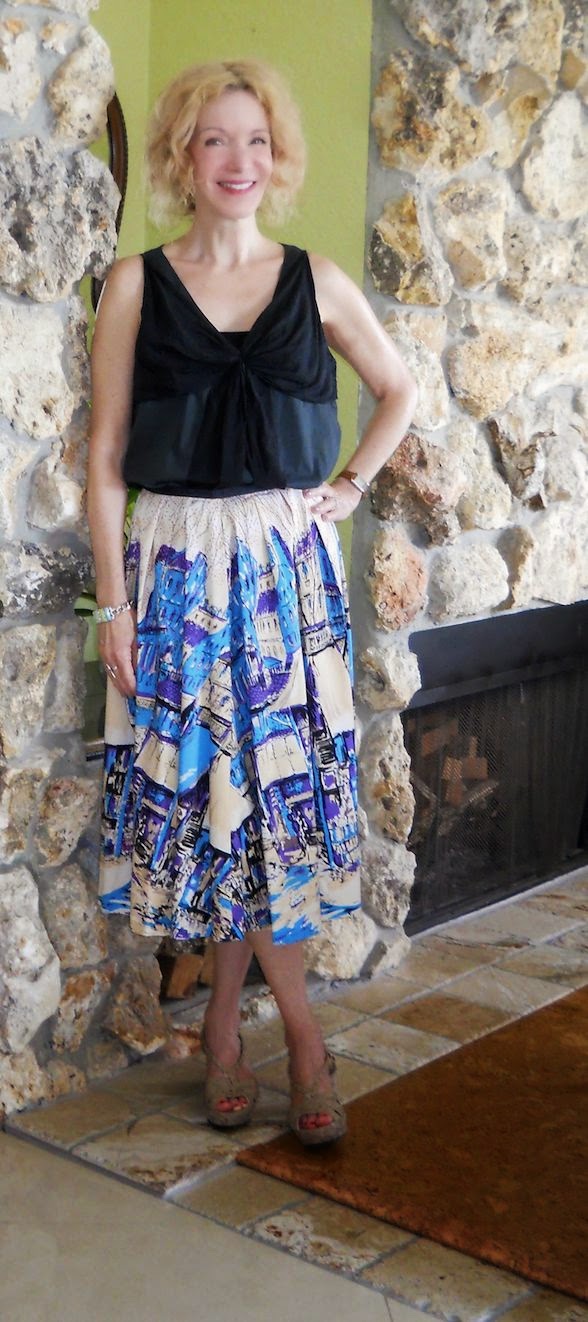 I was happy to find this cute skirt in the “Maybe” bag recently. It’s by Ideology, with a cool Italian(?) street scene and a full silhouette. I think it got to the Maybe bag because it’s challenging to style. So I am up for any suggestions from you fashionistas.