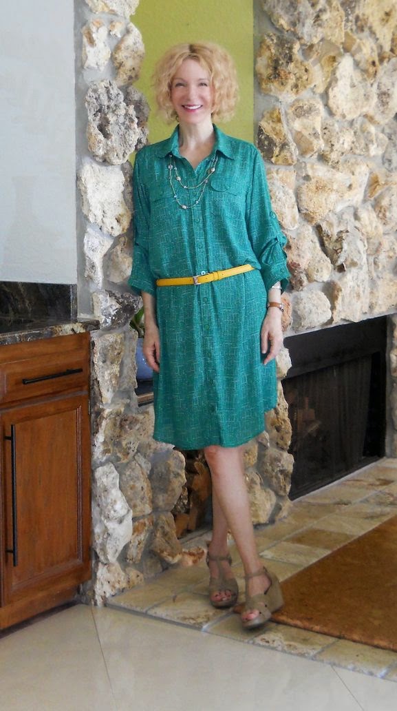 The dress is by CAbi, and it’s easy to wash and dry, and style. It’s really huge on me, so I’ve been belting it. I’ve also worn it as a blouse under a full skirt. It’s now officially my Green Tangerine dress, and apologies to George.