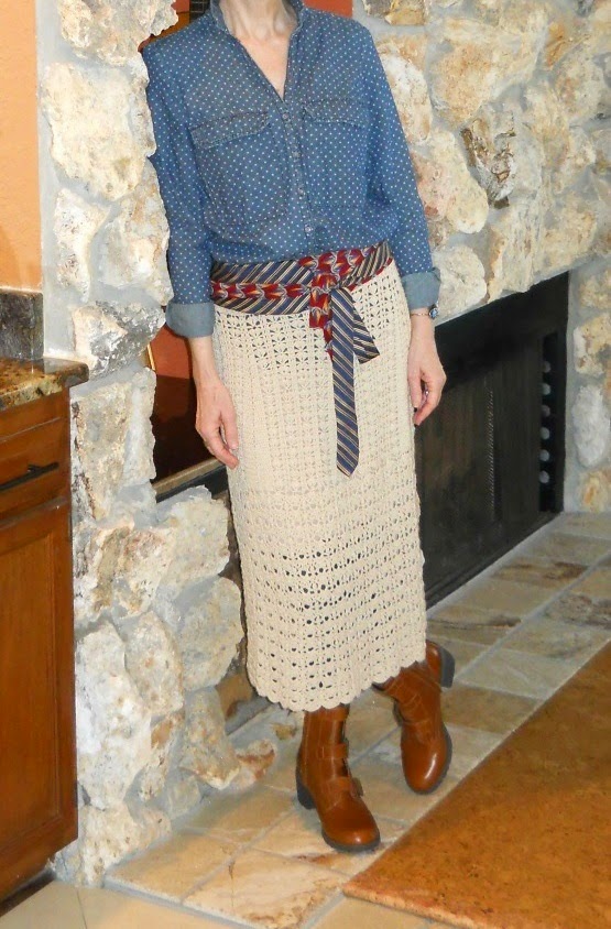 I like Connie's Urban Country idea. The crochet skirt is amazing, I don't think it needs to be shorter, it's a great piece. Maybe a slip underneath, yes. But I like the whole rustic, casual, hippy vibe, it feels very you, and as you know, I like a bit of pattern mixing so it doesn't look too busy to me. I'd add a cowboy hat and really go for it! But as with all things, if you're not feeling it, then mix it up and try the suggestions others have made.