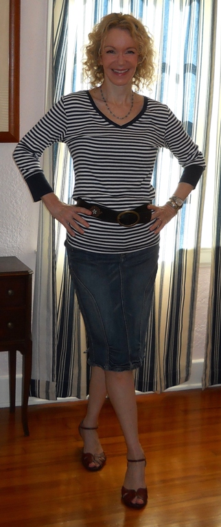 For today I chose an old standby denim skirt by Lucky. This is a youth-oriented brand but somehow this skirt speaks to me. I love the slim fit, the knee length and the curved seaming. The top is new, from Calvin Klein’s “Performance” or activewear line. So I think I’m supposed to go play rugby in it, or at least jog in place. But even though it’s casual I love the fresh stripes for work.