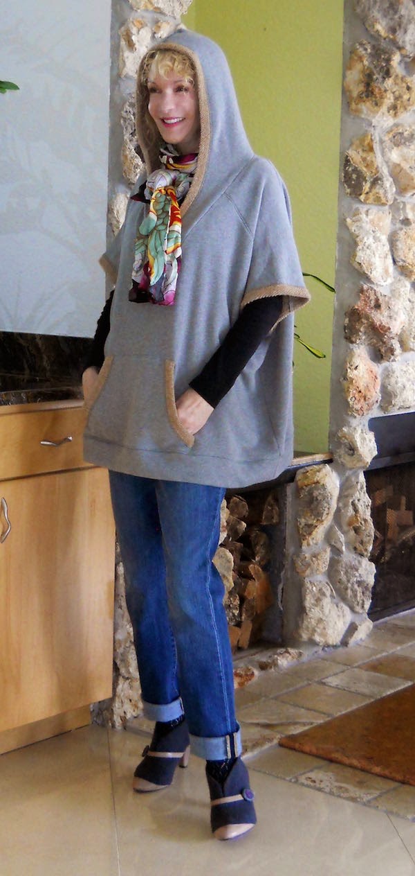 I’m wearing my Old Navy boyfriend jeans, with my funky Poetic Licence shoes. The colorful Christian Audigier scarf (similar on Etsy) was found at a local consignment shop. And though I risk looking like coach Bill Belichick, I love my oversized Eileen Fisher sweatshirt/poncho (similar). It has a pouch, that’s really cool. I bought it from the online consignment store Twice for about $25.
