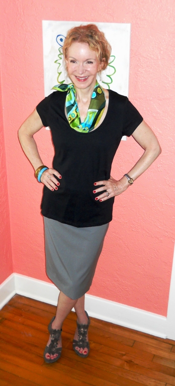 So here I am, enjoying some old favorites and trying to raise the style level with accessories. The Laundry pencil skirt’s been around for years, ditto the black tee. I added a couple of bangles and a colorful silk scarf.