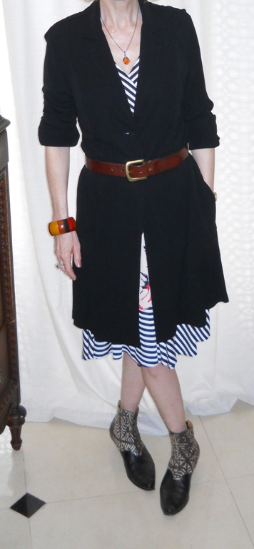 I love the blazer over the dress and how the stripes are just revealed beneath the black – very chic!