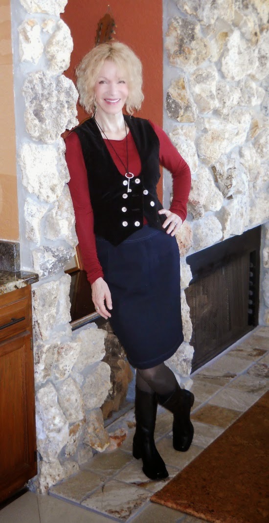 It was about 60 degrees when I got up today, so I got self-permission to wear a fab vintage 1970’s velvet vest. It’s too small for me to button properly but I can’t give it up. A slim denim skirt from Old Navy (here, in plus size only) and a colorful tee (similar) make up the look.