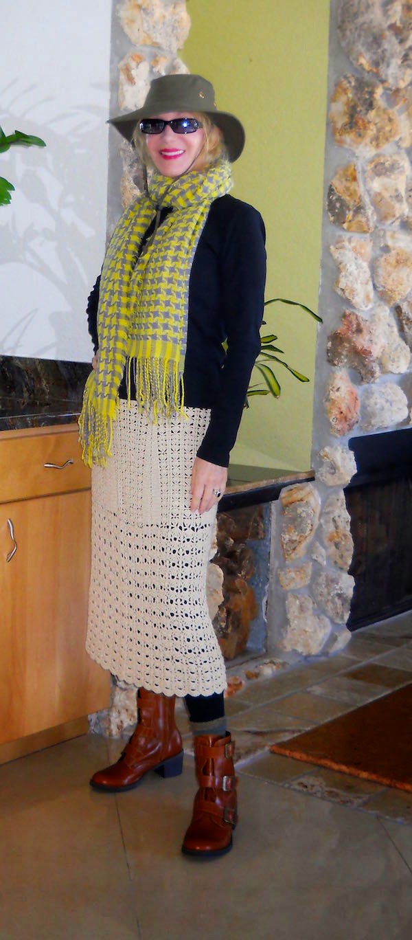 I was getting ready for a bike ride so I had to bundle up: cozy black wool tee (thrifted, similar), leggings and socks, colorful scarf from Dillard’s (similar) and my gorgeous crocheted skirt (made by a friend, similar in blue). My low-heeled Doc Marten boots (similar) are great for biking.