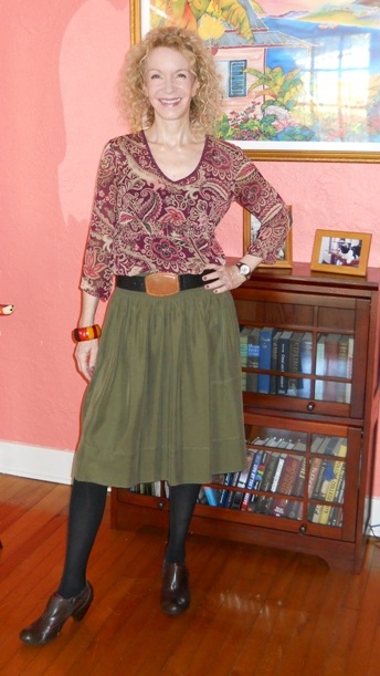 It’s no secret: I favor full, swingy skirts. Make it an olive green, all-silk full skirt and I might be in love. This skirt was snagged from Ann Taylor on clearance, for just $30. It’s actually pretty neutral, and I can wear it with a great variety of tops, winter and summer.