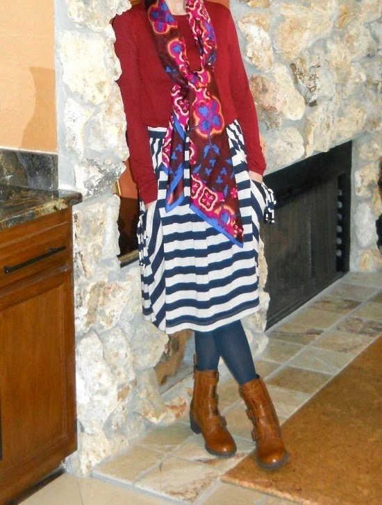 Love the bright red on you, Patti, and the sweet striped skirt. I always have some sort of accessorising going on but rarely think too much about it actually, there's never a day goes by that I don't pile on bangles and rings, it's just automatic! The scarf is beautifully vibrant. Little Old Lady? Hardly!