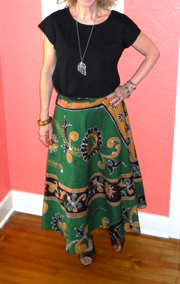 This one is going to be donated, because the wrap doesn’t quite cover all the interesting bits without pinning and fussing. I did want to share it though, because of the striking print and colors. I paired the skirt with a simple black tee, leaf pendant, and various bangles. Had to wear comfortable White Mountain sandals with this look — no ex-hippie would don fancy heels with her funky wrap skirt : >