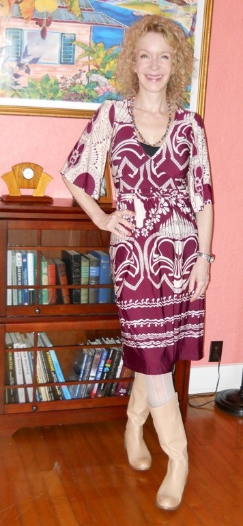 I think the dress is lovely and very flattering. I would not wear such a lightweight satiny dress with boots though, I'd save it for spring or summer and wear it with delicate sandals. The print almost looks tiki to me, so I'd keep the accessories sort of tribal. A big chunky beaded necklace might be nice. Although I like the sleeves the dress would probably look more modern sleeveless.