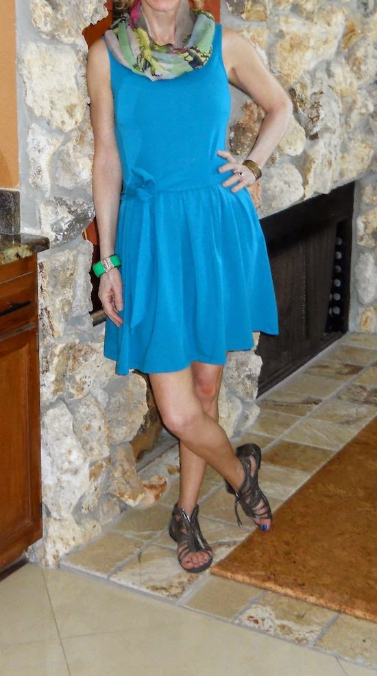 Love it Patti! That dress is pretty! I love the blue color on you. I also love the scarf. I love butterflies and dragonflies, the colors are so nice on you.
