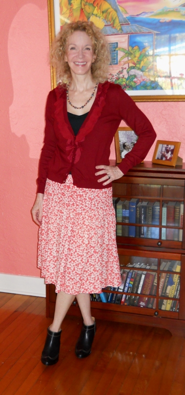 We had a slightly cool spell, so I took the opportunity to wear a bright cotton cardigan today. It was a find at the “new” JCPenney’s. Their monthly sales can be awesome, with markdowns as low as $4 — and that’s what I paid for this ruffled cardi!