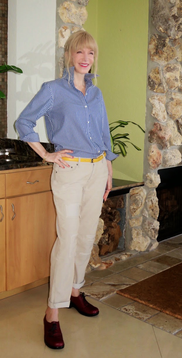 A crisp striped shirt (this one by Ralph Lauren was thrifted; similar here) goes with everything. Today I paired it with scruffed-up corduroys from GAP (similar) and a skinny yellow belt for a pop. The oxfords are from Calvin Klein (similar), who can be relied on to deliver a clean look.