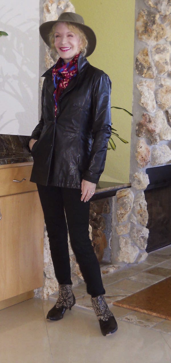 The mysterious woman in black, c’est moi. Black (faux) leather (thrifted, similar) does that to a person – makes us look more secretive and a little dangerous. A hat further obscures my identity. They’ll recognize me at the Beachside Cafe by my fuzzy hair pieces only.