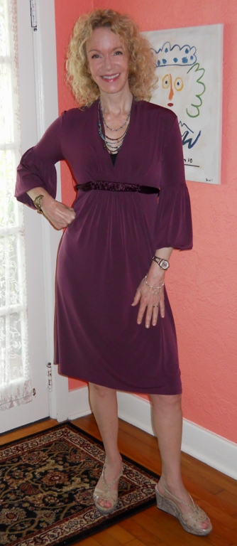 This Max and Cleo dress was on sale for less than $10, and it’s one of “my” colors, a saturated purple. I often find an under-bust tie a little young for me, but this one is OK to my eye. So easy to get dressed today – I just layered some necklaces (thank you, Debbi from She Accessorizes Well for inspiration), and a new peacock cuff from Forever 21. The shoes are new too, Anne Kleins that I picked up at Macy’s at one of their super-sales.