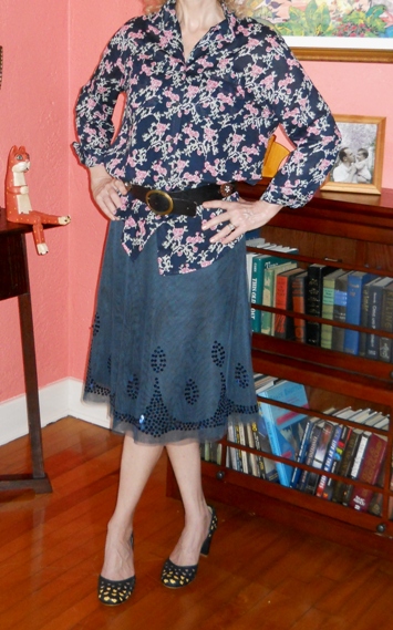 I really love the skirt. The crying feet remind me of one Christmas party, circa 1983, when I was wearing those awful pointy-toe pumps, and they were some synthetic, non-stretchy material so my toes got more cramped, bruised, and blistered by the minute. I was hobbling toward a chair when a coworker's husband stopped to chat, and he kept me standing there for 45 minutes while he talked. I can't imagine the expression on my face during that conversation.