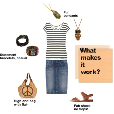 I’m ready to head out, to lunch with my sister, to the bookstore or basketball game, in my trusty denim skirt and tee. A wee bit Blah. One of my style goals is to make every outfit “work”, with moderate effort and a not-unlimited budget.