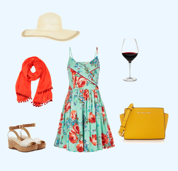 Always a good choice for a lunch downtown: a colorful dress, wedge sandals, a light scarf to stay comfortable in the air conditioning, and a bright handbag. The temperature is in the mid-80’s already, so not much more is necessary. Something like this: