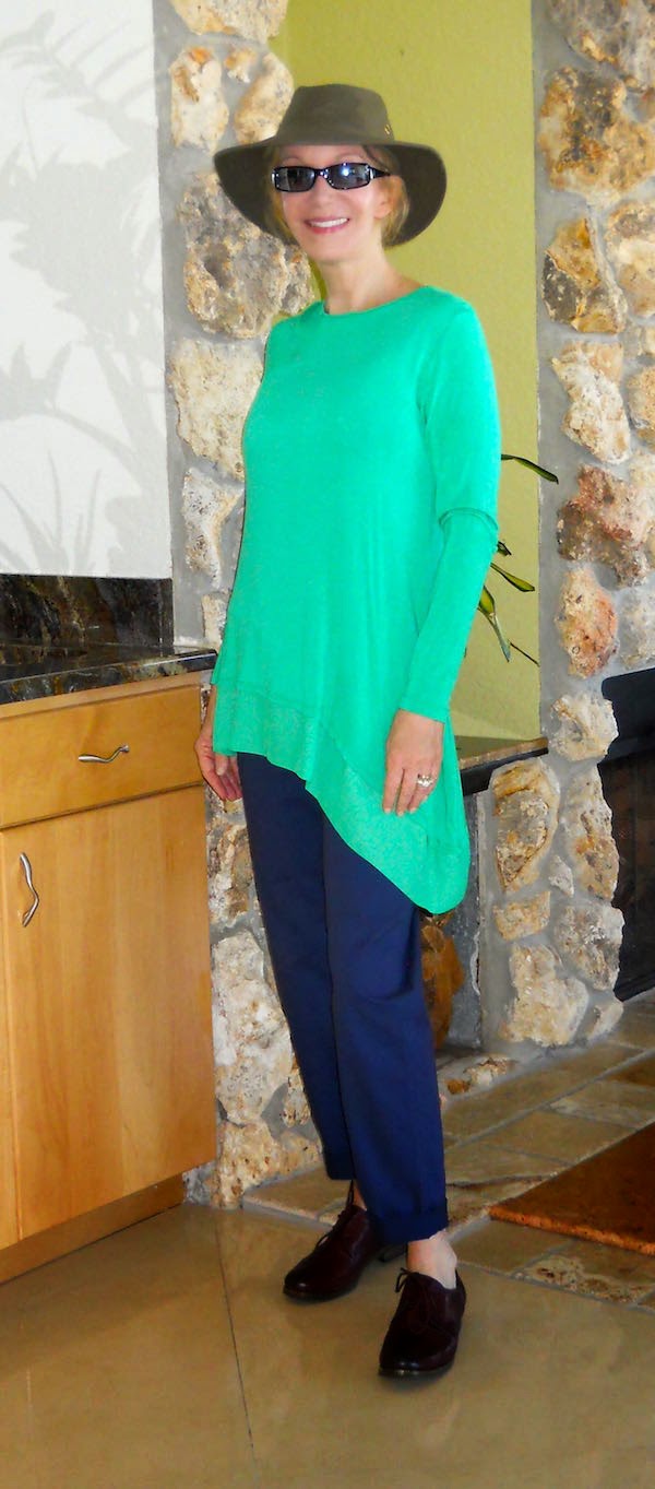 The sea-green asymmetrical top (similar) is courtesy of Diane Gilman, a very cool NYC designer who specializes in chic casual pieces. It’s baby-soft and really lovely to wear all day. Oxfords are by Calvin Klein, and the safari hat came from Lowe’s Building Supplies. Yes! never rule out a store as a possible style resource.